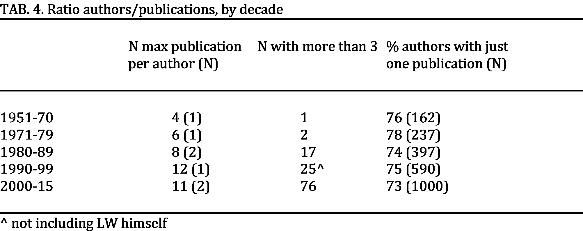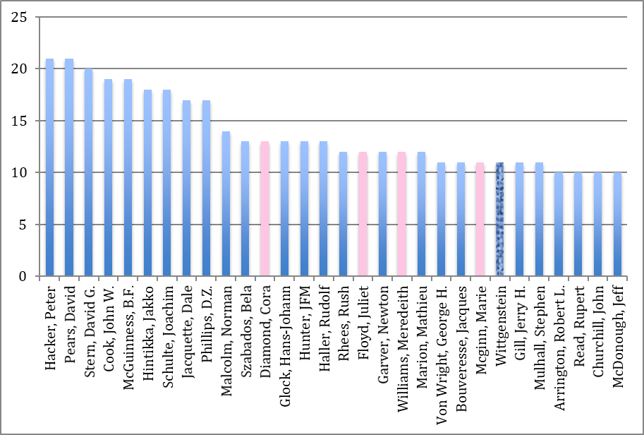 I can’t understand the footnote on the tab “not including LW himself” referred to the number of authors with more than 3 publications with “Wittgenstein” in the title in the 90’s.