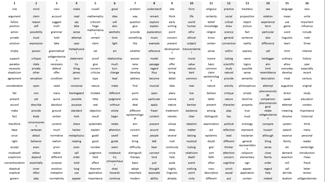¶ 13 Leave a comment on paragraph 13 0 We have organized our paper in three virtual sections. First, we describe the temporal structure of LW’s work: to have a literature on Wittgenstein you need to have Wittgenstein’s literature, so it seems necessary to have at least some knowledge of the latter. Second, we focus on the literature (i.e. scholarship) on LW as we have been able to represent it through an analysis of bibliographic data drawn from the Philosopher’s Index, an electronic bibliographic database especially devoted to philosophy as a discipline. This is the central section of our paper, and the longer one, in which we attempt to describe and to map with the help of a few sophisticated statistical tools Wittgensteinian scholarship in its properties and changing forms. Third, we set forth a series of provisional explanations for our results, also considering the research on Wittgenstein beyond and besides the philosophical field, looking for trends and patterns of circulation of his ideas across different research areas and disciplinary fields, mapping what we would call, following Bourdieu (2002), the ‘international field of Wittgensteinism’.[5]. In particular, we advance four hypothesis, mutually compatible and reinforcing, two referring to exogenous and two to endogenous explanations in the sociology of cultural life (Kaufman 2004), which we suggest could be used to make sense of the results of our distant reading.