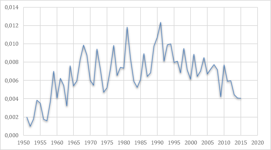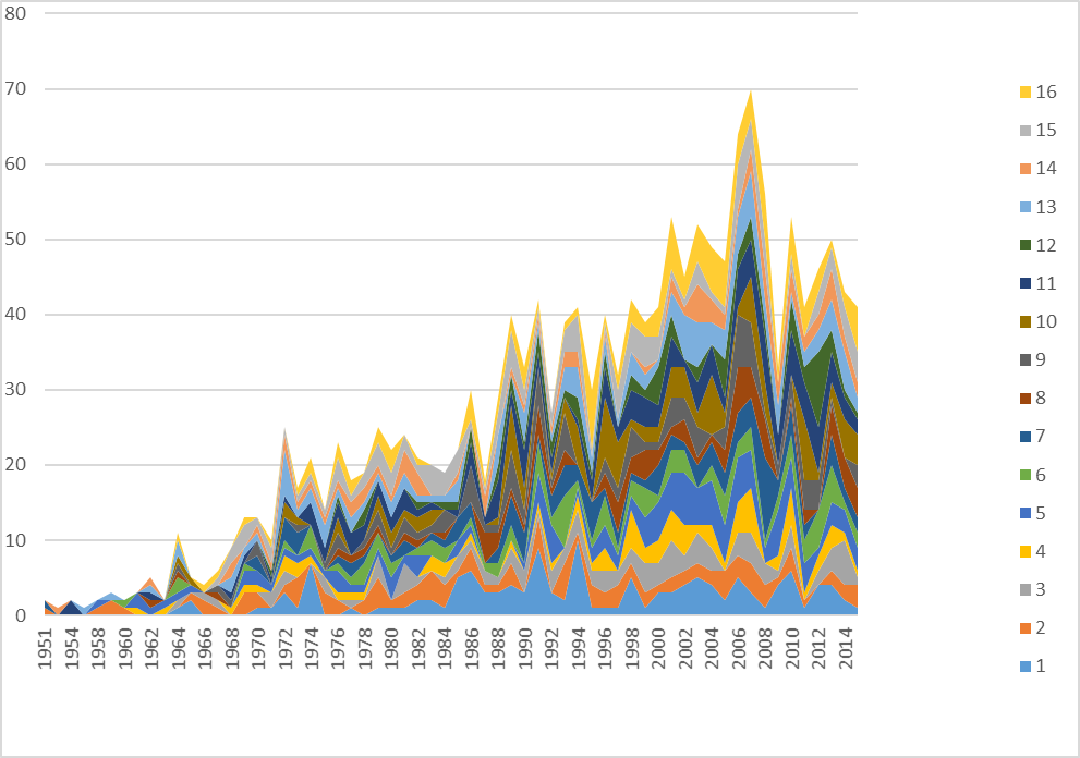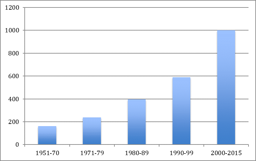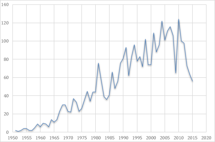 ¶ 43 Leave a comment on paragraph 43 0 Fig. 2a. Publications on LW by year according to the PI, 1951-2015. Total frequencies.