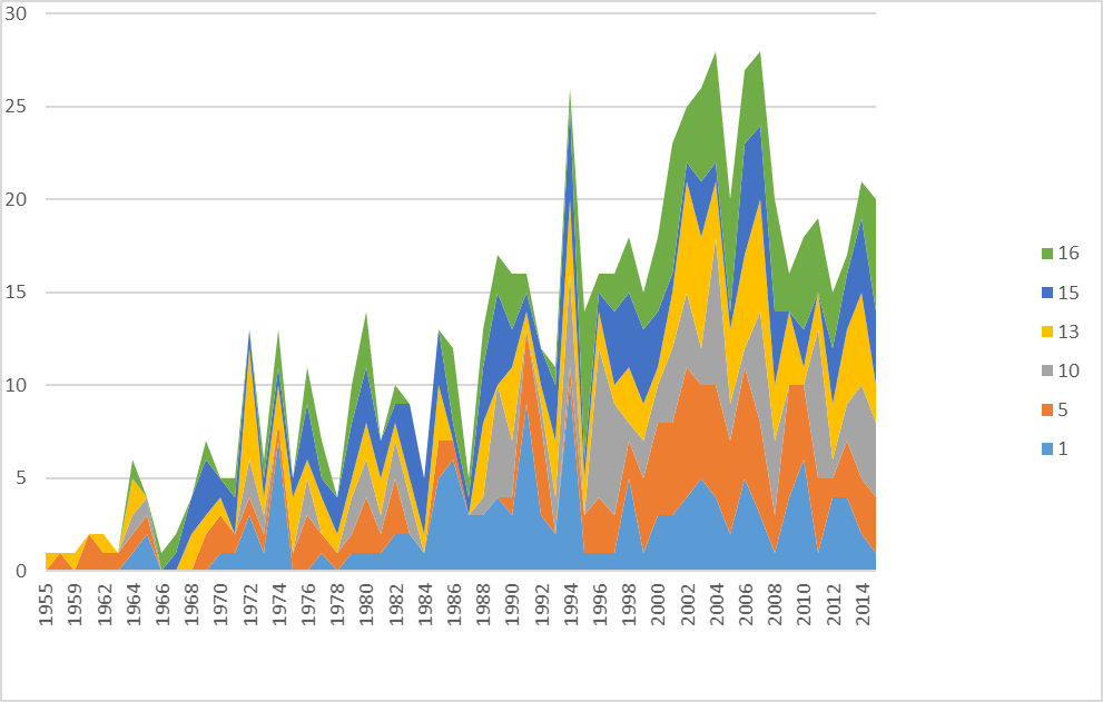 Question about timespan making: are numbers relative to a span (let’s say the 80’s) to be referred only at the said span or are they comprehensive of previous works? In oder words: these numbers indicate works published during the timespan or works available during the timespan? In the first case, the stability of the percentage of “occasional” wittgensteinean authors could be interesting and would rise an interest towards percentage of other groups of authors (would it be useful to define classes other than the “occasional”one?).