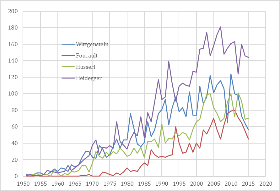 ¶ 48 Leave a comment on paragraph 48 0 Fig. 3. Literature on Wittgenstein, Foucault, Husserl and Heidegger compared, 1951-2015.