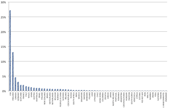 ¶ 360 Leave a comment on paragraph 360 0 [44] A further interesting information we get from WS is the geographical dispersion of the population of scholars writing on LW. Their distribution according to country (academic location) is shwn in figure A3, in the Appendix. The geographical dispersion of the field is worth of being noticed: the expected majority of Angloamerican scholars is confirmed (they account for almost the 40% of the population, see also Garver 1987 and Glock 2008) but this is accompanied by a plurality of geographical standings, ranging from France to Finland, from Spain to China, from Romania to South Korea till Zimbabwe (see for LW’s reception in various countries Helgeson, 2011; Zhang 2014; Schulte 2003; on the Japanese case see Botz-Bornstein 2003).